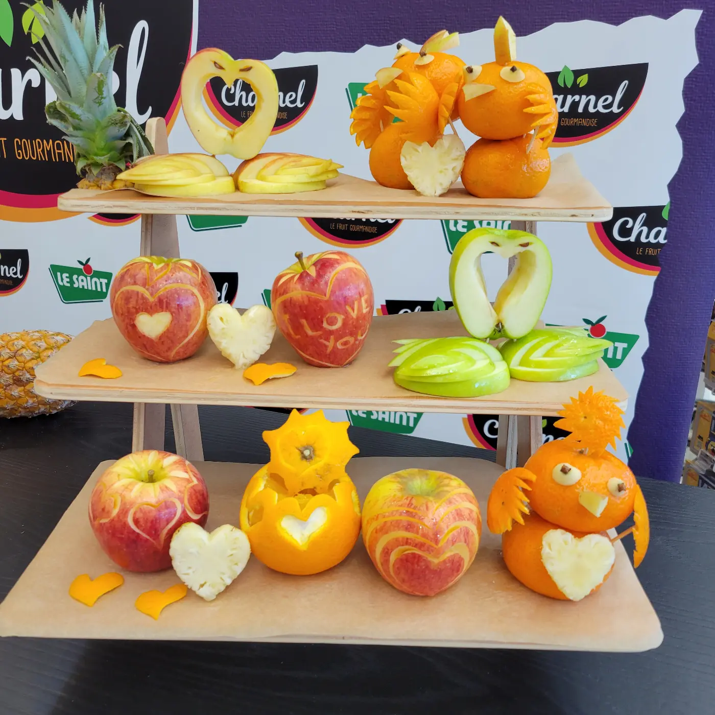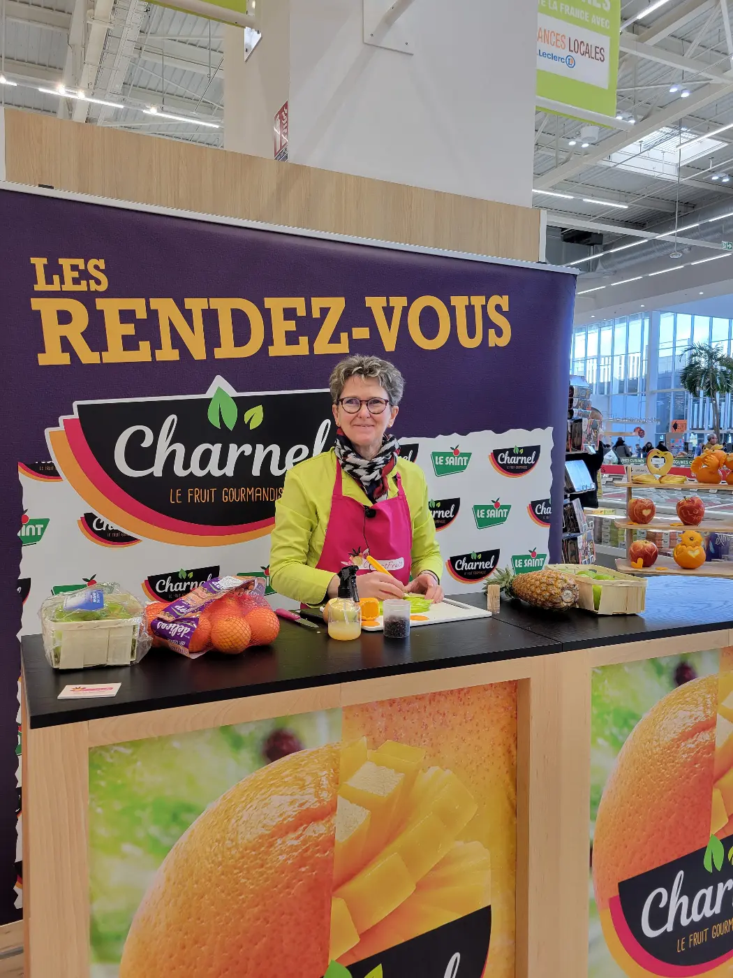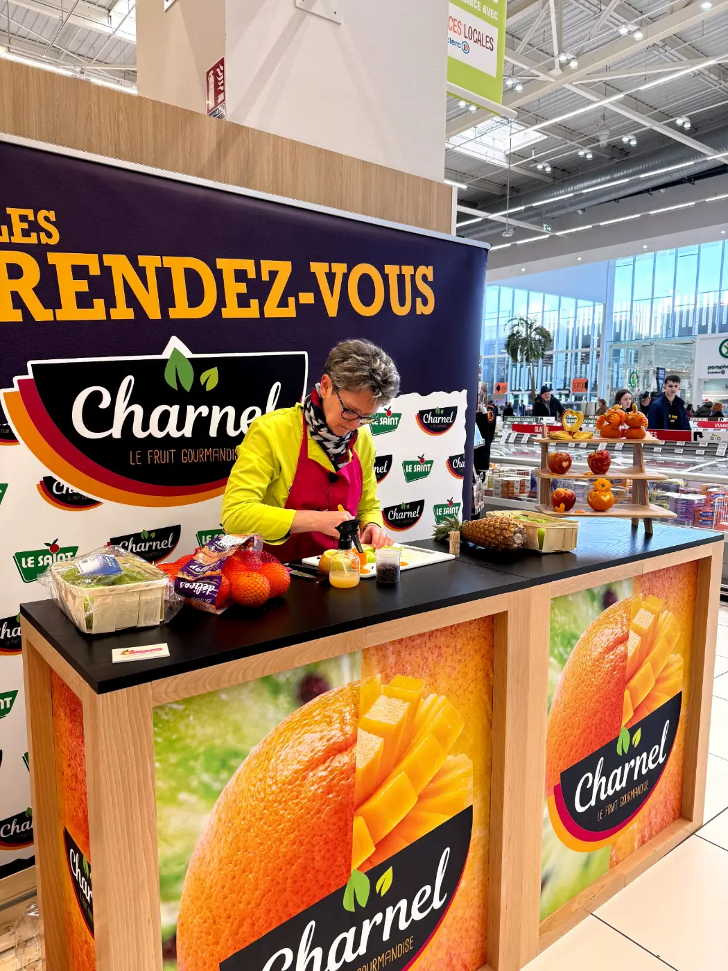 Démonstrations de sculptures sur fruits le week-end dernier au Centre E.Leclerc de Gouesnou sur le Stand Charnel du réseau Le Saint.
